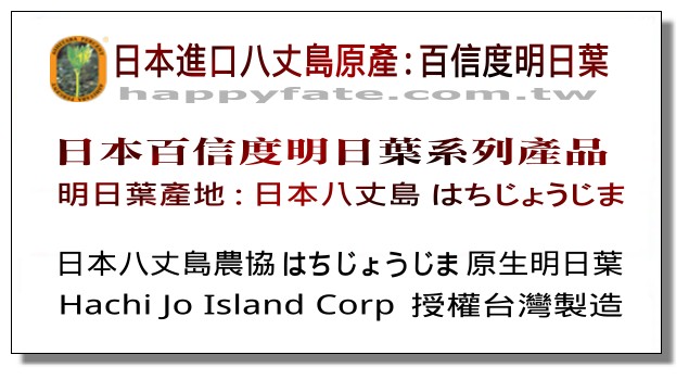百信度明日葉系列是日本大阪大學馬場博士技術指導的優良產品,至今已有三十五年的品牌歷史,採收當氣溫低於23℃以下季節產的自然農耕無污染栽培之八丈島明日葉嫩芽,採用獨家技術製造,當天採收製成,完全保留新鮮營養成份。