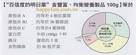 科學分析百信度明日葉的基礎營養結構,非常完善,在日本有蔬菜王之美譽,23℃以下季節採收,營養成份最佳,不會有任何有害物質,嚴密的品質管控,享譽全球35年,可安心作為家人日常保養食用。